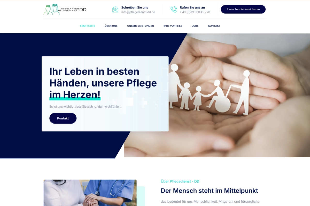 Sot, Pflegedienst DD ka një faqe web që është lehtë e navigueshme, funksionale dhe shumë e orientuar nga përdoruesi. Faqja u mundëson pacientëve dhe familjeve të gjejnë shërbimet që u nevojiten në një mënyrë të thjeshtë dhe të qartë. Ajo gjithashtu ndihmon në rritjen e besueshmërisë dhe transparencës duke komunikuar me qartësi për angazhimin e kompanisë për ofrimin e kujdesit të personalizuar dhe miqësor.
